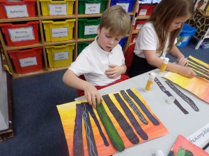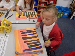 In our art lessons we looked at an artist called “Bibi” who is from Nigeria. We recreated some of her paintings and studied all the different African patterns which we included in the painting.